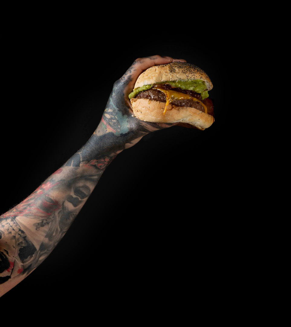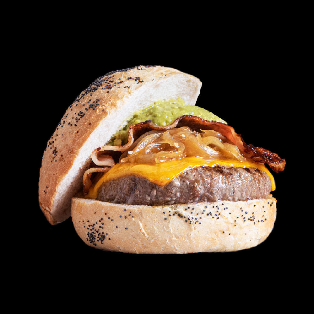 Pan de semillas de amapola, 180gr de carne de vaca, guacamole, bacon crujiente, cebolla caramelizada y queso cheddar.