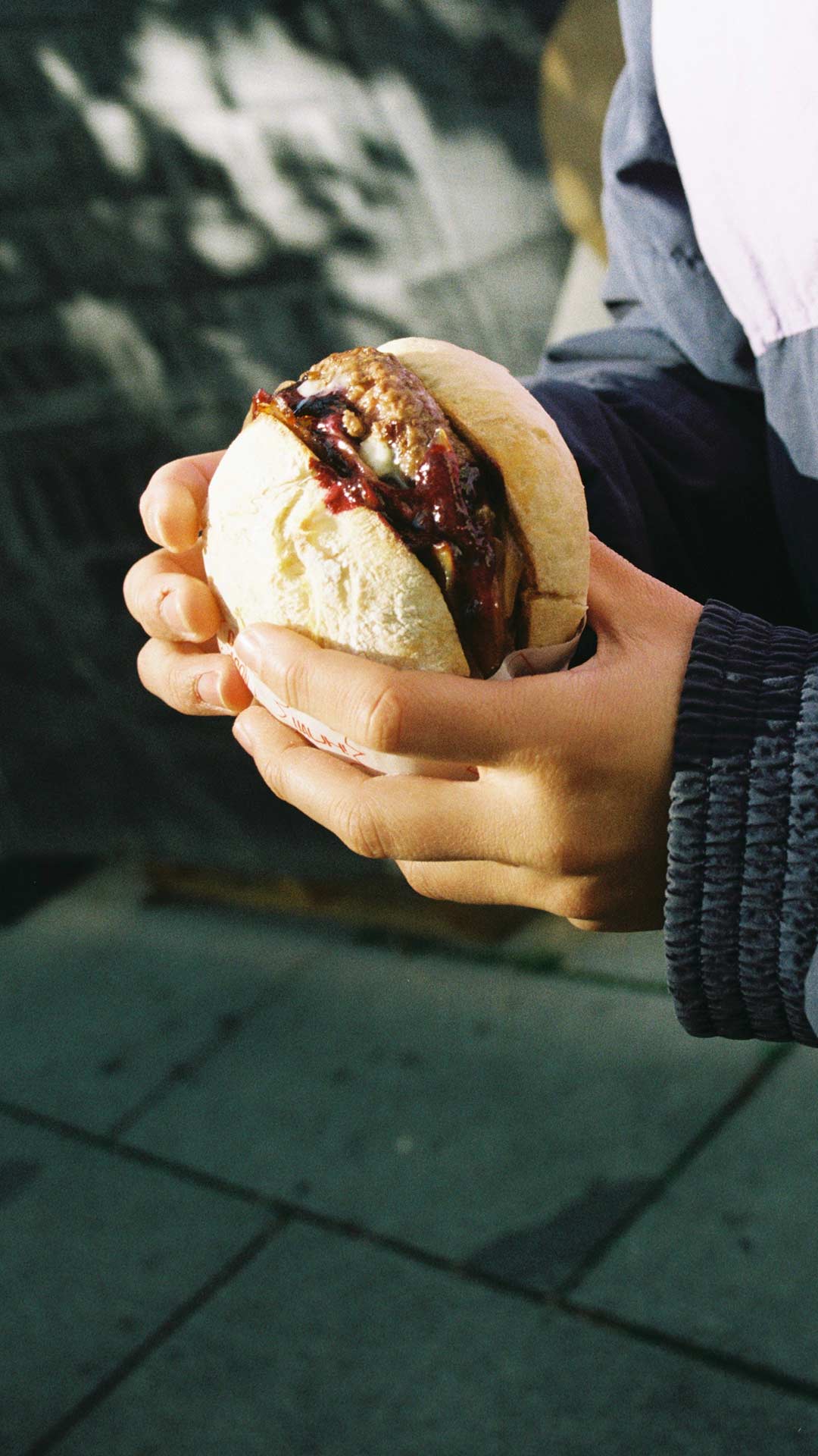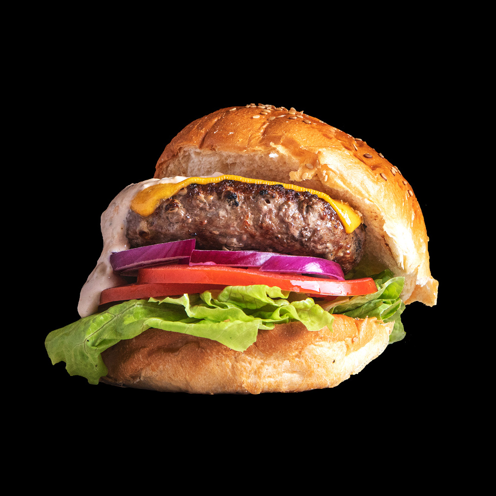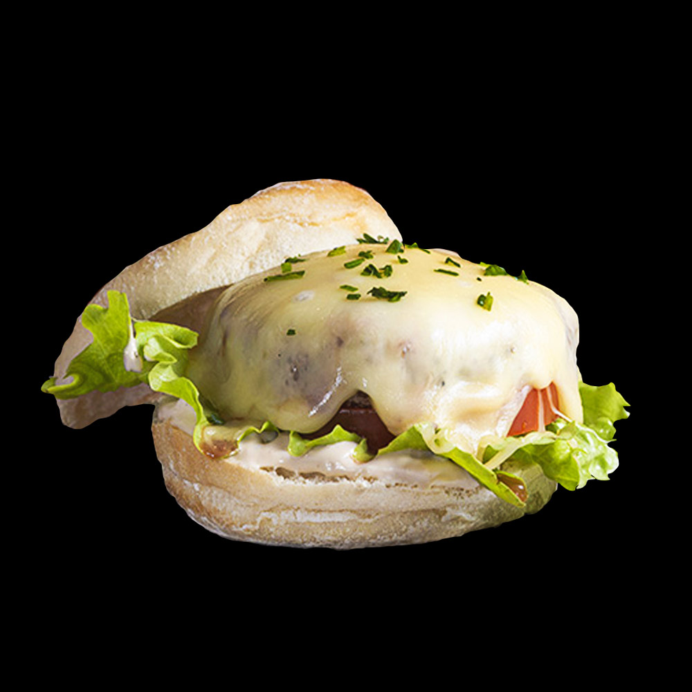 Pan rústico, 180gr de carne de potro, queso raclette fundido, tomate natural a la parrilla, cebolla crujiente y mayo de trufa.