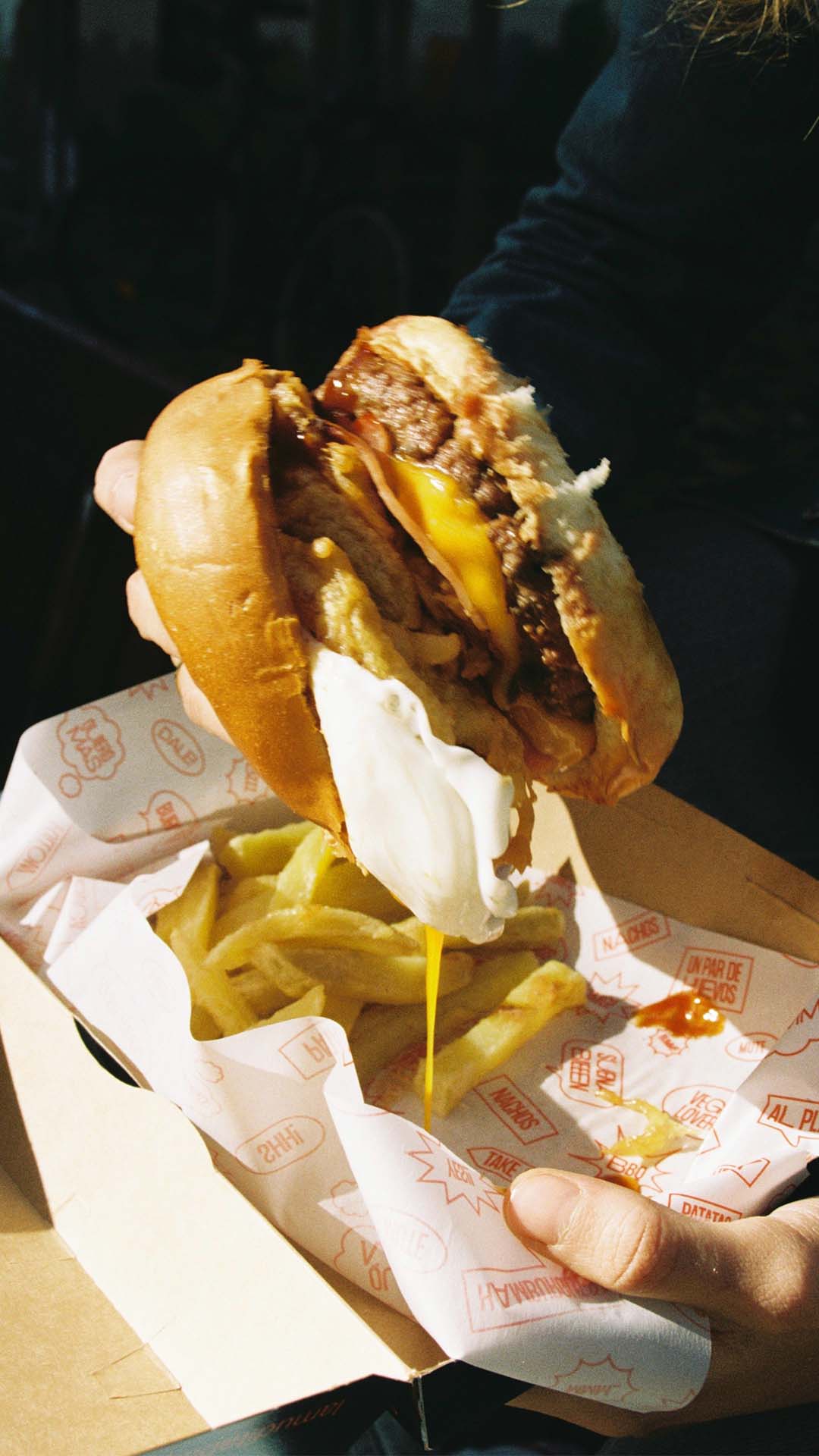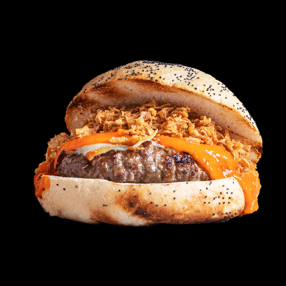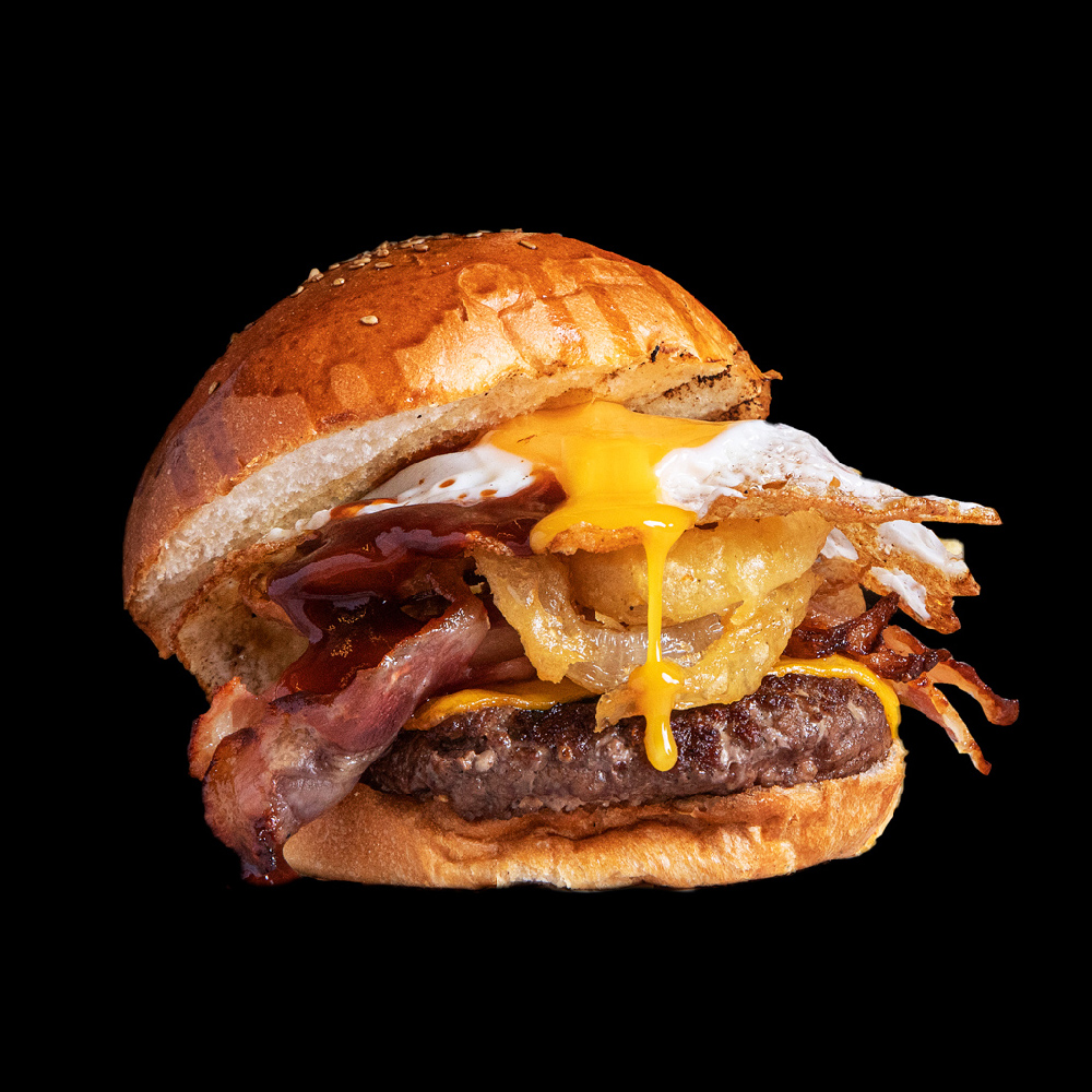 Pan brioche artesano, 180gr de carne de vaca, queso cheddar, bacon crujiente, aro de cebolla casero y huevo frito bañado en salsa barbacoa.