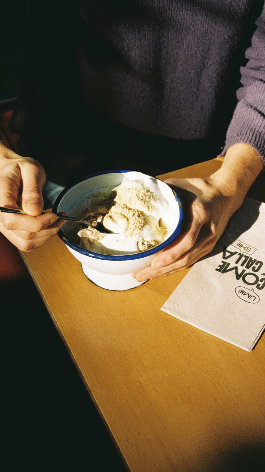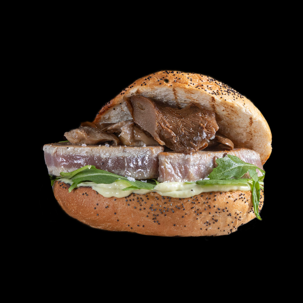 Pan de semillas de amapola, taco de atún fresco marcado en la parrilla, rúcula, setas portobello y mahonesa de wasabi.