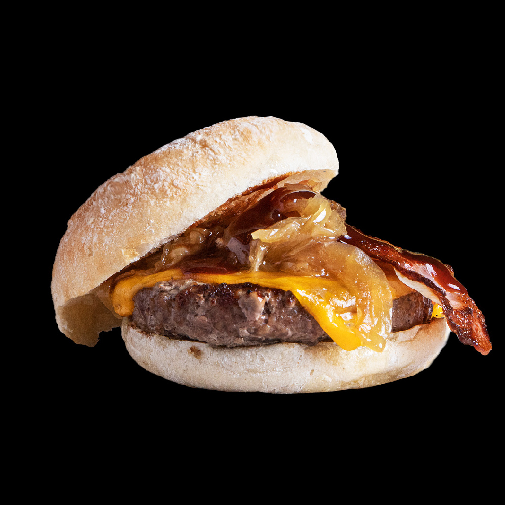 Crujiente pan rústico, 180gr de carne de vaca, queso Monterrey Jack, bacon crujiente, cebolla caramelizada y salsa barbacoa.