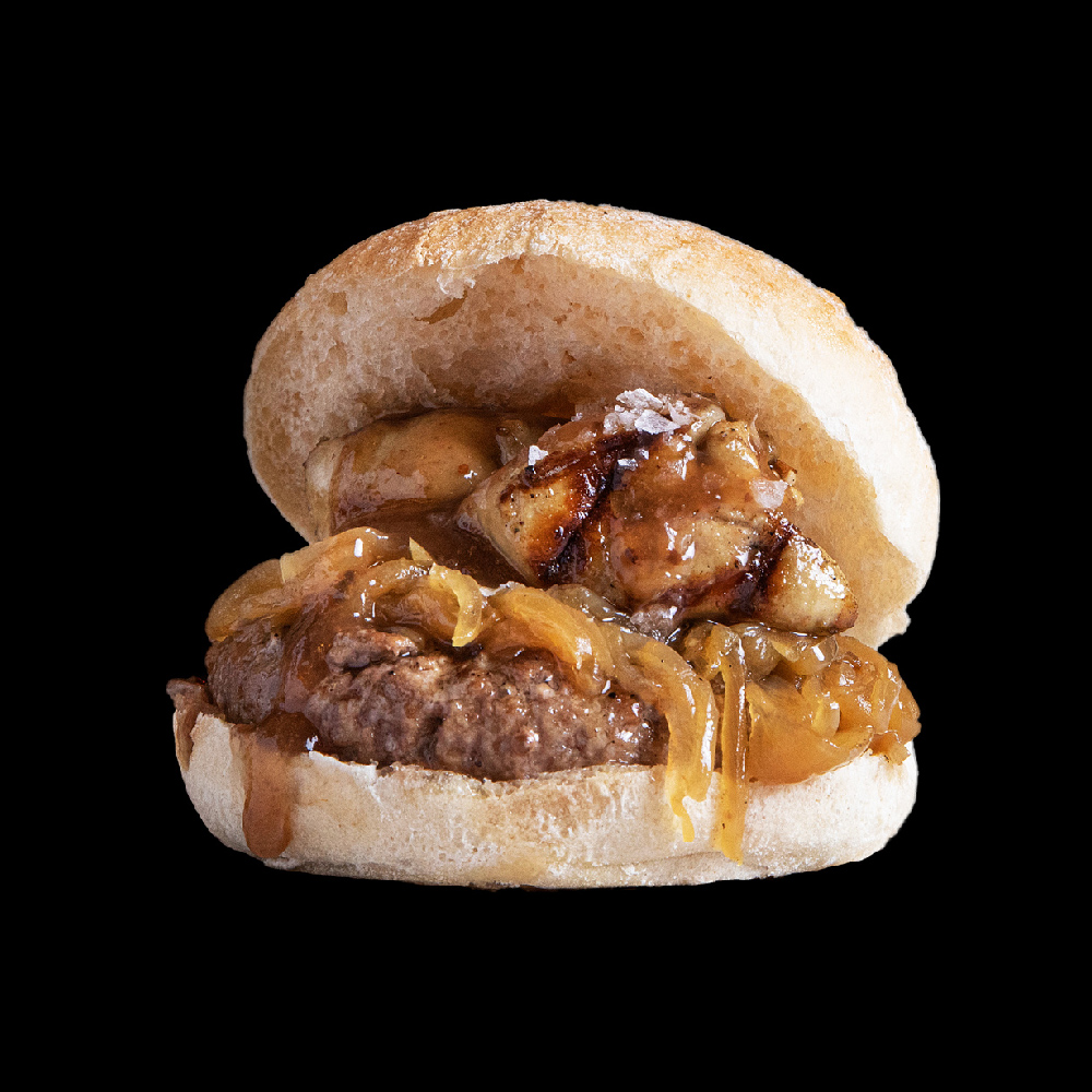 Crujiente pan rústico, 180gr de carne de vaca, foie fresco a la plancha, cebolla caramelizada y salsa de higos.