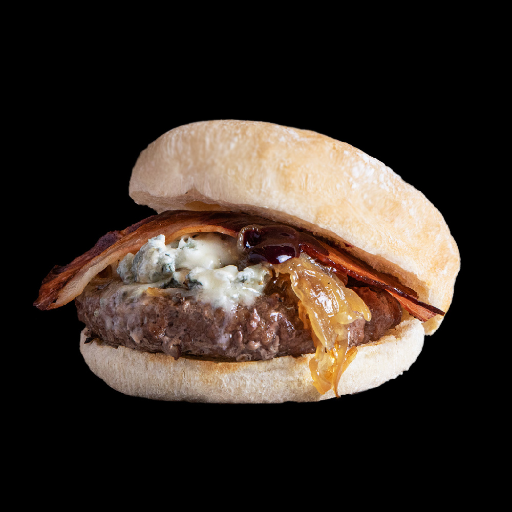 Crujiente pan rústico, 180gr de carne de vaca, fundido de queso gorgonzola, cebolla caramelizada, bacon crujiente y salsa de frutos rojos.