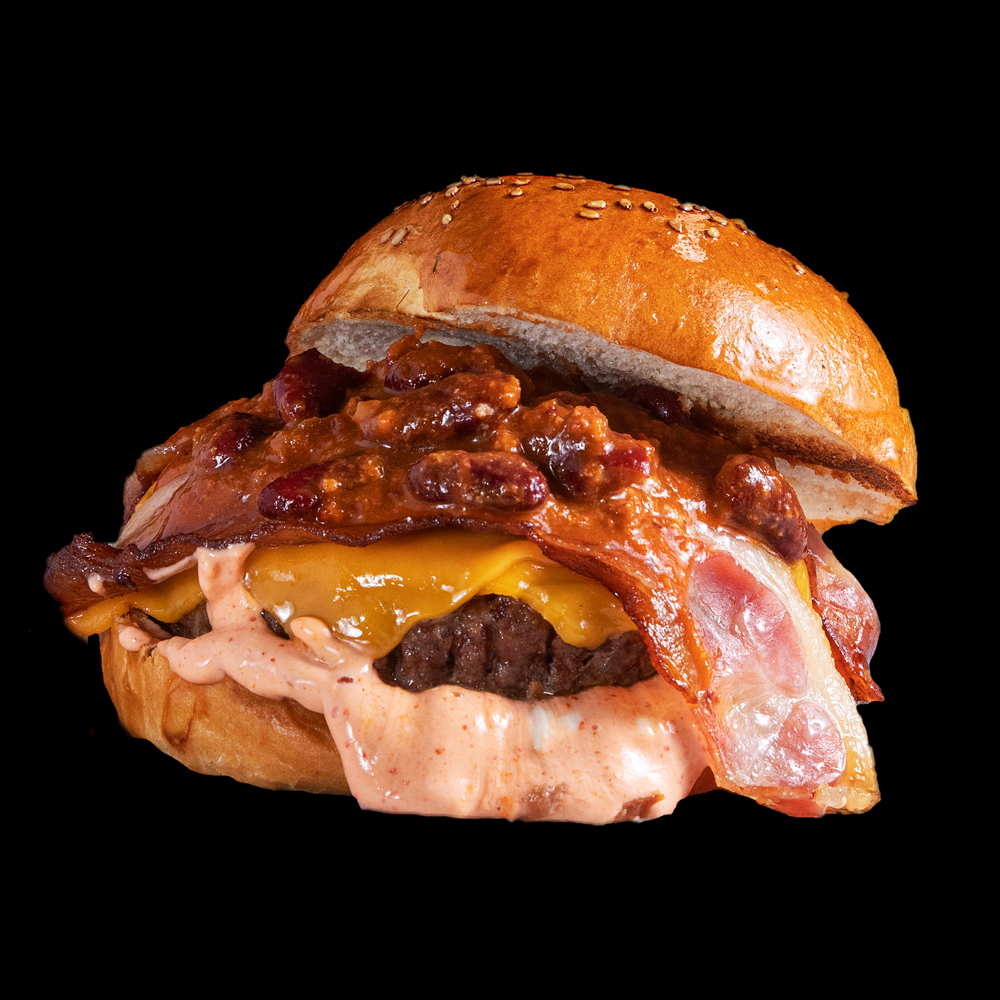 Pan brioche artesano, 180gr de carne de vaca, queso cheedar, bacon crujiente, chili con carne con un toque picante y salsa chipotle.