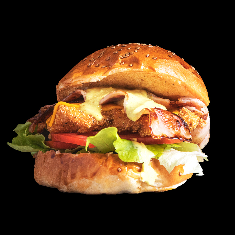 Pan brioche artesano, pechuga de pollo crunchy estilo cajún, lechuga, tomate, bacon crujiente, queso cheddar y salsa de curry.
