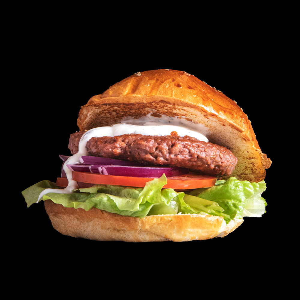 Pan brioche artesano, burger 100% vegetal a elegir*, lechuga, cebolla roja, tomate y salsa de yogur