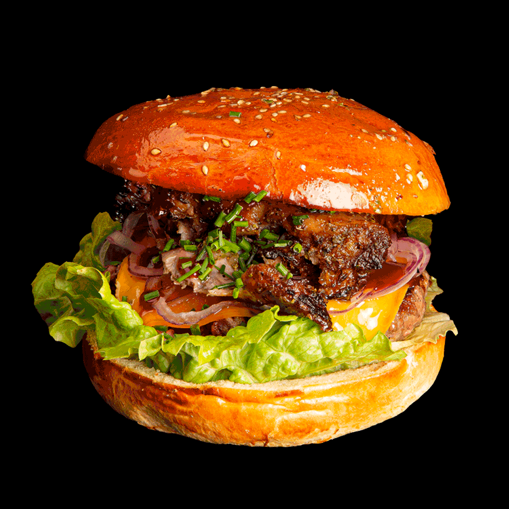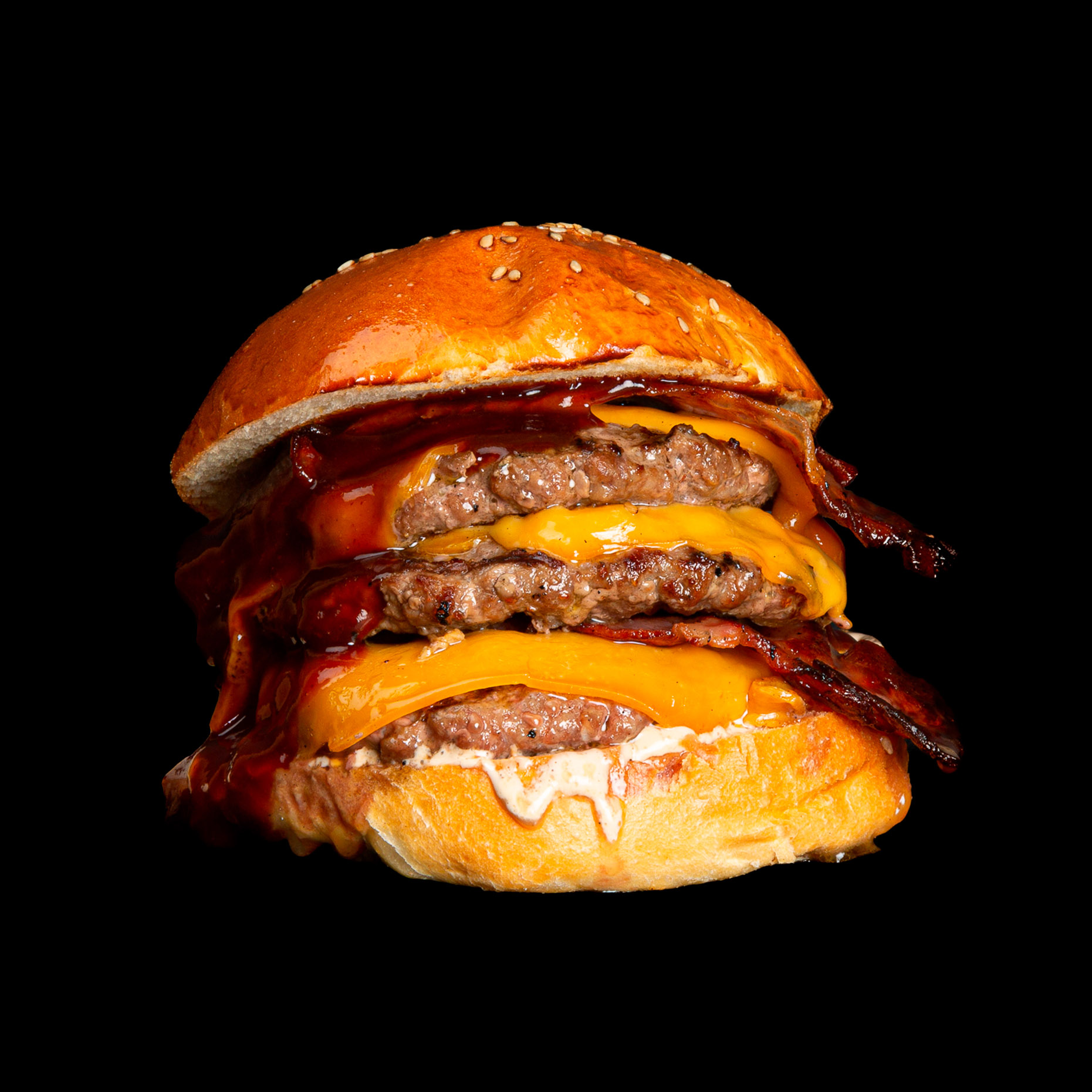 Ligero pan brioche, dos carnes de buey de 100gr estilo "smash burger", doble queso cheedar, bacon crujiente y smoked bbq.